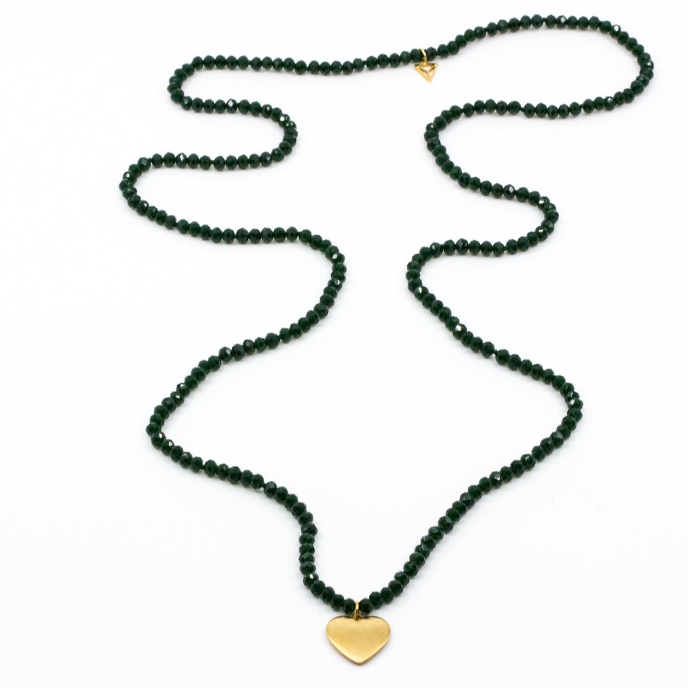 Hand-knotted necklace of green faceted glass beads with a small heart in stainless steel. Length: approx. 90cm in circumference. Size of hearts: 12mm